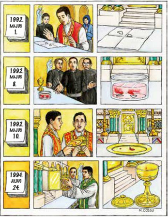 1992-ben, a május 1-jei misét követően a szolgálattevő éppen a megmaradt szentelt ostyát tette a helyére, amikor észrevette, hogy néhány ostyadarab a korporáléra hullott. Az Egyház előírásának megfelelően a papnak a darabokat ilyenkor vizes edénybe kell tennie, amit azután a tabernákulumban helyeznek el, várva, hogy az ostya feloldódjon. A következő néhány napban több pap is ellenőrizte az edényt, de semmilyen változást nem láttak. Hét nappal később, május 7-én, pénteken, kinyitották a tabernákulumot, és azt látták, hogy az ostyadarabok színe vérhez hasonló vöröses színre változott. Május 10-én, a vasárnap esti két misén az áldoztatáshoz használt paténán apró vércseppek jelentek meg. 1994. július 24-én, a gyermekek számára tartott vasárnapi misén, amikor a pap kivette a pikszist a tabernákulumból észrevette, hogy annak oldalán vér folyik.