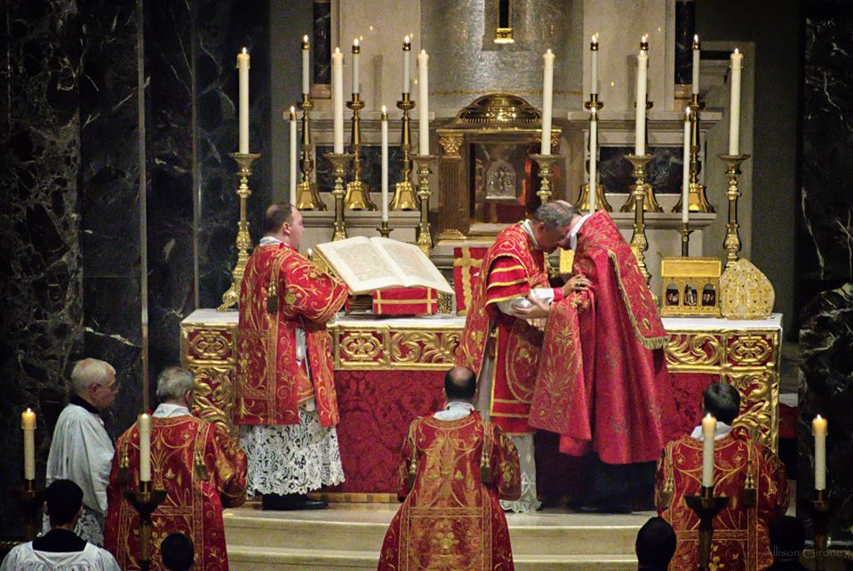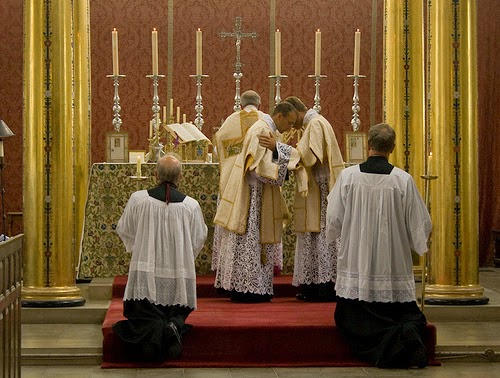 A Pax szertartást a római miserítusban az Agnus Dei után végzik úgy, hogy a celebráns megcsókolja az oltárt, amely Krisztus elsődleges szimbóluma a templomban, és amelyen a legszentebb Oltáriszentség is nyugszik. Így a pap magától Krisztustól és az általa fölajánlott legszentebb áldozatból nyeri el az isteni békességet (nem úgy, ahogy a világ adja). A békességet tehát közvetlenül Krisztustól származó üzenetként vagy ajándékként kapja, és rögvest tovább is adja, mégpedig hierarchikus rendben! Olyan ez, mint az Újszövetség egyetlen igaz Főpapjáról, a Krisztusról mint Főről lecsorduló kegyelmi kenet, amely a Főről csordul alá, hogy szakállán keresztül azután még ruhája szegélyét (vagyis a misztikus test minden egyes tagját) átitassa: “Íme, mily jó és mily gyönyörűséges az atyafiaknak együtt lakniok! Mint főn a kenet, mely lefolyik a szakállra, Áron szakállára, mely lefolyik ruhája szélére; mint a Hermon harmata, mely leszáll Sion hegyére. Mert oda rendel az Úr áldást és életet mindörökké.” (Zsolt 132)