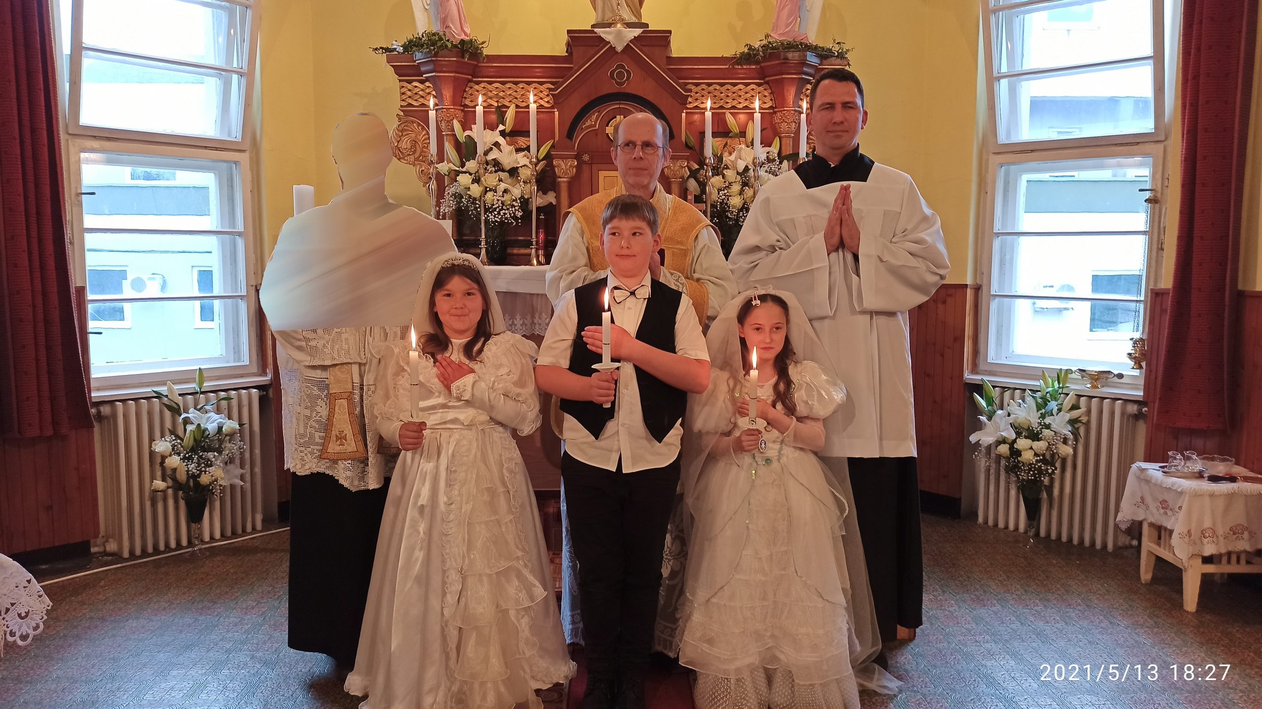 mert első alkalommal Urunk Mennybemenetele (In Ascensione Domini ~ I. classis) ünnepén, három: egy fiú és két leánygyermek először járulhatott a Szentgyónás (Bűnbocsánat) szentségéhez, valamint a szentáldozáshoz. Köszönjük a Szent X. Piusz Papi Testvériség papjának, Klaus Wilhelm atyának a szentmise bemutatását, illetve a prédikációt.