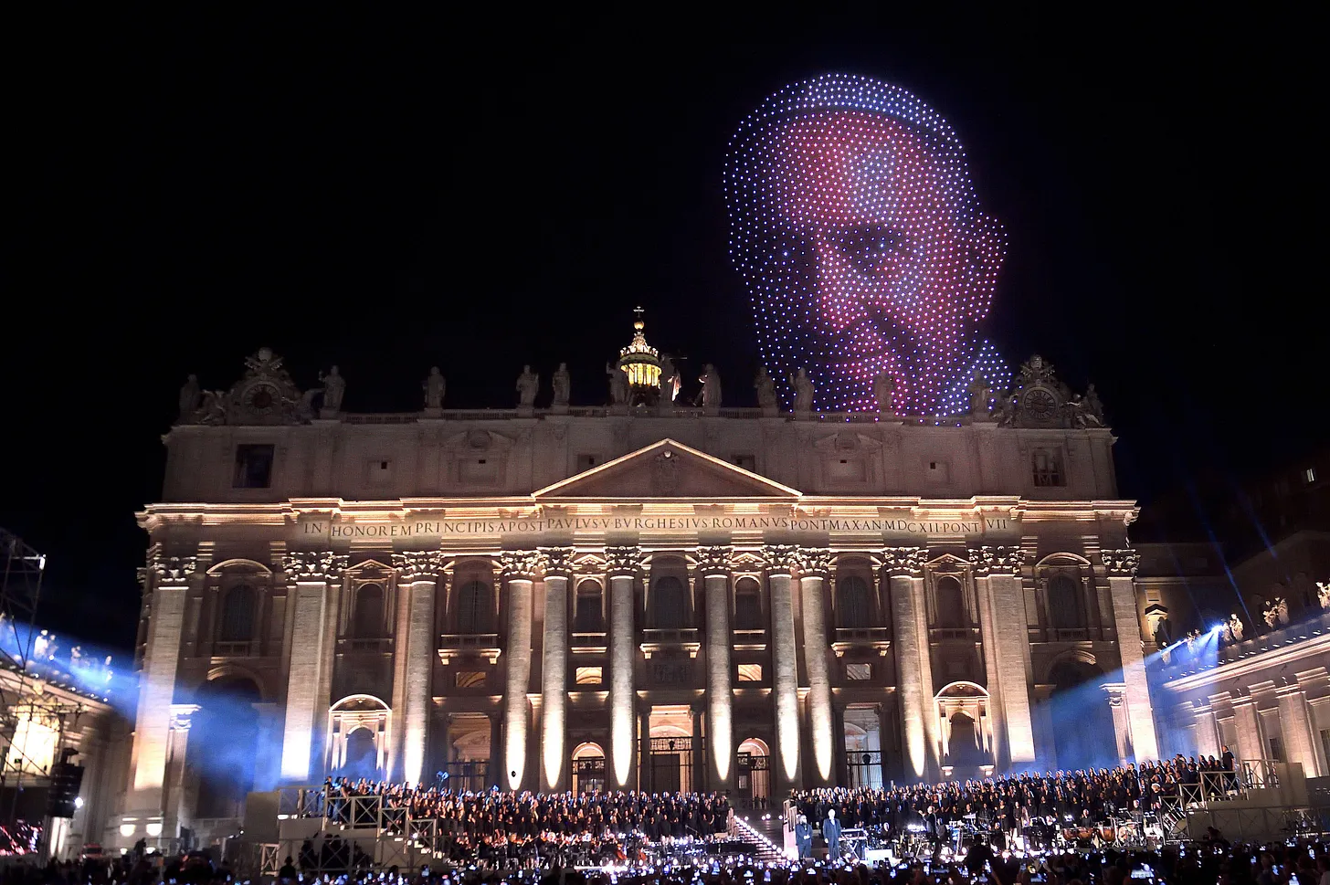 A Vatikán bejelentette, hogy az estét „3500 drón látványos bemutatója teszi egyedülállóvá, amelyek megvilágítják a Szent Péter-bazilika kupolája feletti eget”. Gambetti bíboros megjegyezte, hogy a drónok Ferenc pápa arcát és a Sixtus-kápolna képeit vetítik majd a kupolára. Végül azonban Ferenc pápa arca a kupola körüli levegőbenjelent meg.